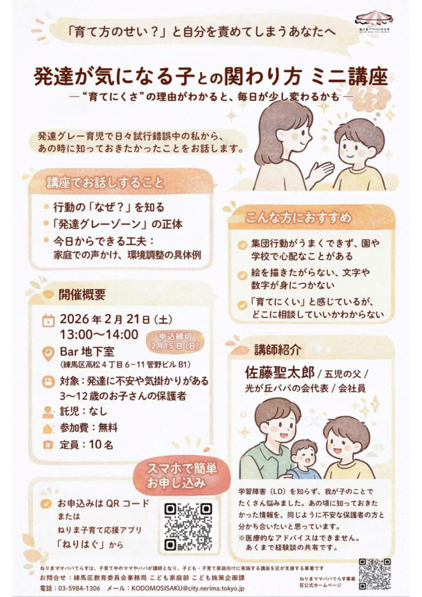 練馬区より、ねりまママパパてらす講座のご案内です。 ねりまママパパてらす講座は、子育て中の母親や父親を講師とした、子ども