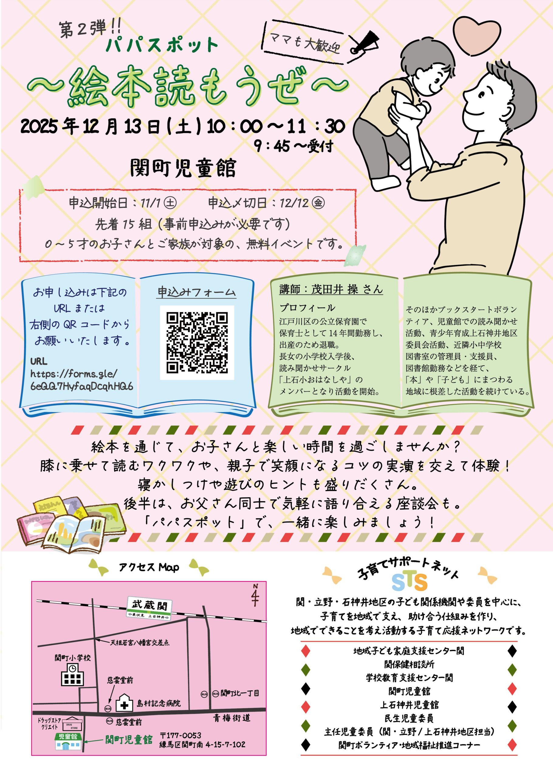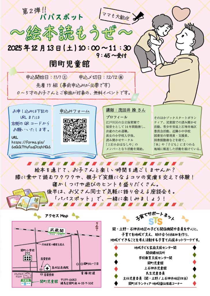 2025年11月11日 【12/13】第2弾パパスポット~絵本読もうぜ~ 公開日:2025/11/11 絵本を通じて、お子さんと楽しい時間を過ごしませんか? 膝に乗せて読むワクワクや、親子で笑顔になるコツの実演を交えて体験! 寝かしつけや遊びのヒントも盛りだくさん。 後半は、お父さん同士で気軽に語り合える座談会も。 「パパスポット」で、一緒に楽しみましょう! 日時 2025年12月13日(土)10:00~11:30 会場 関町児童館 料金 無料 定員 先着15名(要申込) 申込み 添付のチラシをご覧ください。 開催場所の町名 関町 情報元団体 子育てサポートネットSTS