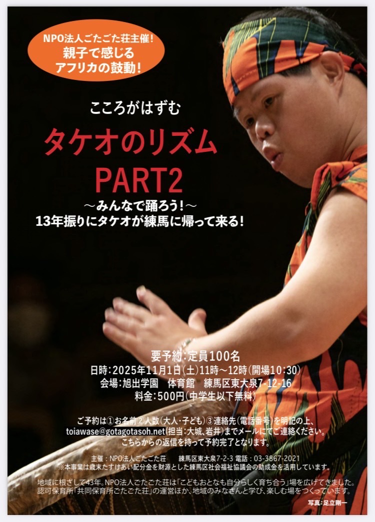 今回は、アフリカンドラムの名手お二人との共演です。年齢を問わずからだとこころを弾ませてご一緒に楽しみましょう。