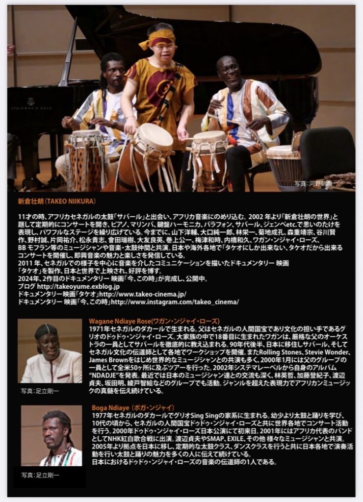 その活躍は海外にもおよび、2011年セネガルでの演奏活動を中心にドキュメンタリー映画「タケオ」が、そして2024年完成の2作目「今、この時」が公開中です。
